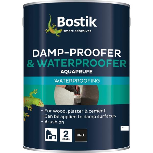 Bostik Aquaprufe Damp-Proofer & Waterproofer provides a highly efficient sandwich damp-proof membrane for floors - Bostik Aquaprufe Damp-Proofer & Waterproofer must be overlaid with a minimum 50mm flooring screed. It also acts as a waterproofer for walls when plastered or plaster boarded over. Bostik Aquaprufe Damp-Proofer & Waterproofer must always be covered as it remains tacky.