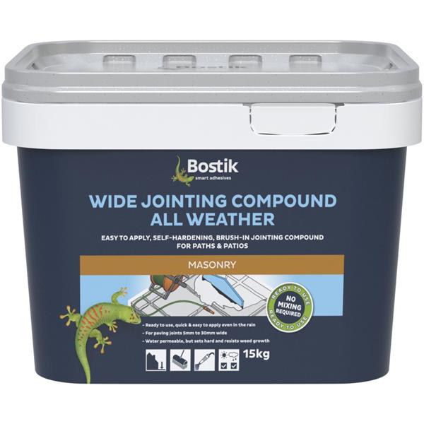 Bostik Wide Jointing Compound for paths & patios is a blend of polymers and sand that bind together on contact with air. Once cured it forms a solid joint, which will resist weed growth and sand loss from power washing or mechanical cleaning. Bostik Wide Jointing Compound is a single component and does not require mixing or special tools. It is suitable for most types of domestic paving including natural stone, concrete, clay and terracotta in joints 5mm to 30mm in width. It is water permeable allowing the paving to drain. Bostik Wide Jointing Compound, when cured, is unaffected by salt and freezing conditions.