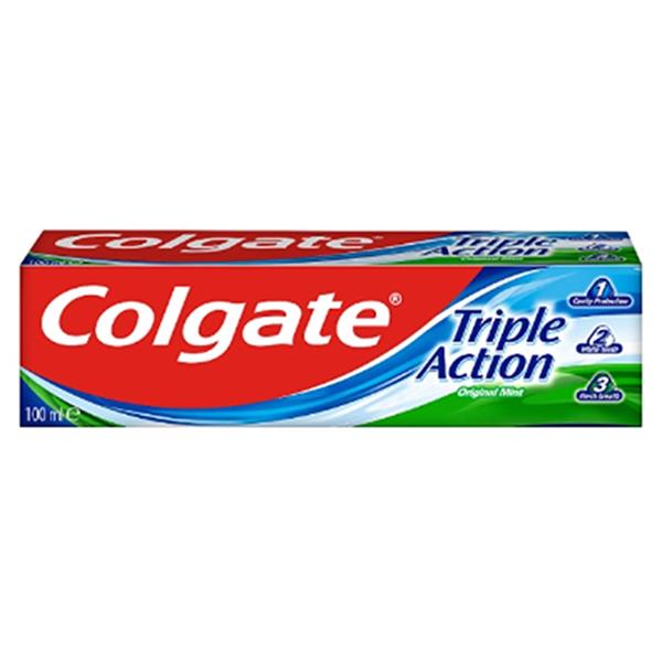 The triple-clean feeling of Colgate Triple Action Toothpaste will keep you smiling all day. It contains fluoride to help protect against cavities, helps remove surface stains for whiter teeth, and has a great mint taste for fresher breath. Features Contains fluoride Helps protect against cavities Helps remove surface stains Ingredients Calcium Carbonate, Aqua, Sorbitol, Sodium Lauryl Sulfate, Hydrated Silica, Sodium Monofluorophosphate, Aroma, Cellulose Gum, Sodium Carbonate, Xanthan Gum, Benzyl Alcohol, Sodium Saccharin, Sodium Bicarbonate, Eugenol, CI 74160, CI 74260
