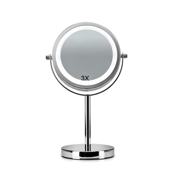 This sleek, freestanding cosmetic mirror is ideal for bathrooms for any shape or size. With its statement gleaming finish and rich warm glow, this double sided mirror is an essential addition to any bathroom or makeup table. Chrome finish double sided mirror with LED illumination LED lighting around the edge of the mirror lights up both sides evenly and provides an all round even illumination of your face 3 x magnification on one side, with the other side featuring x 1 true view Freestanding adjustable mirror can be tilted backwards or forwards for a suitable angle