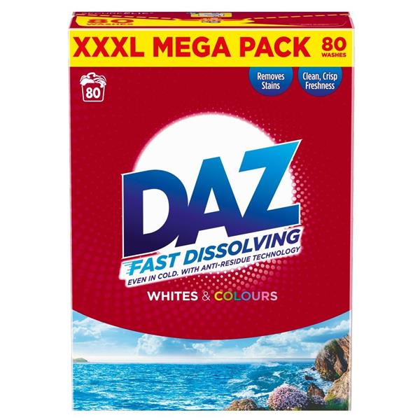 Keep your whites bright and your colours vibrant with Daz Powder Whites + Colours - 80 Wash. This powerful laundry detergent is specially formulated to tackle tough stains and leave your clothes looking and smelling fresh after every wash. With an impressive 80 washes per box, you can count on Daz to keep your laundry clean and bright for weeks to come.