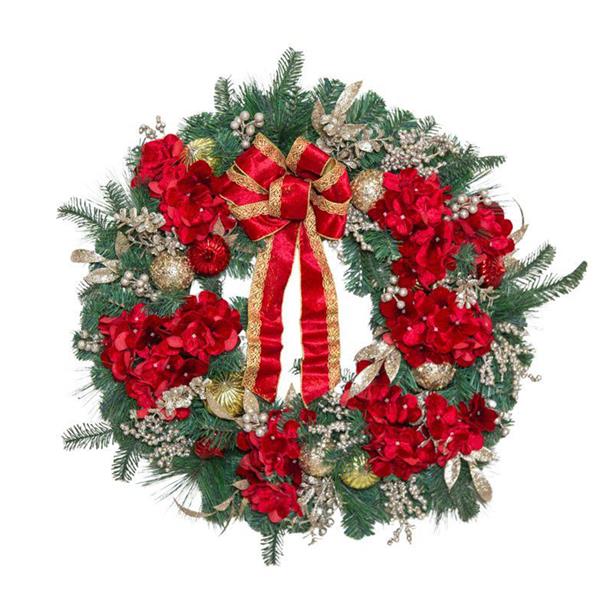 Make a grand festive statement with this Deluxe Red Hydrangea Wreath. Measuring 76cm in diameter, this stunning wreath features lush red hydrangea blooms, gold accents, and sparkling ornaments, all arranged on a rich base of green pine foliage. A velvet red and gold ribbon bow completes the elegant design.