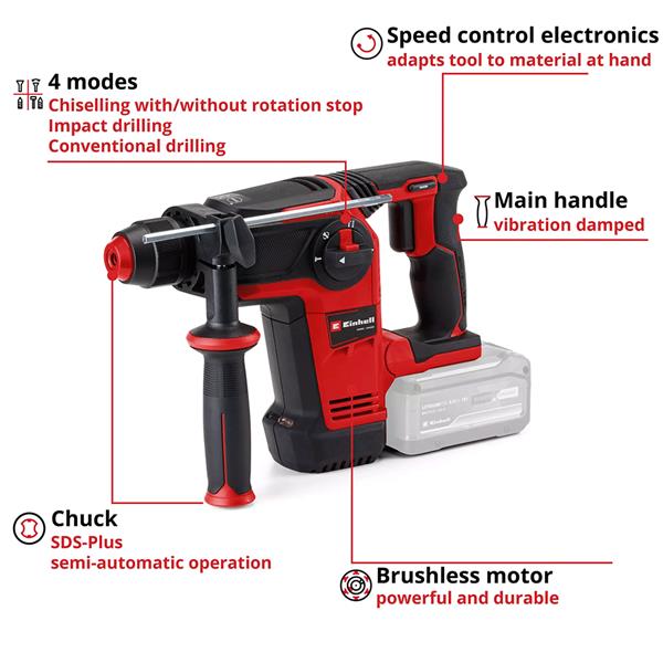 Part of the trusted Power X-Change range, this 18V rotary hammer features Einhell’s PurePOWER Brushless motor for greater efficiency, longer runtime and durability — backed by a 10-year motor warranty when registered.