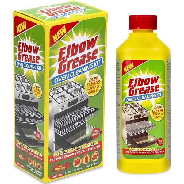The new Elbow Grease ® Oven Cleaning Kit is your 'All in 1' deep clean oven cleaner which comes in an easy to use bottle format with bag and gloves includes, helping to keep the whole process as simple as possible for you. The Only Cleaner You'll Ever Need!. Deep Cleans Racks & Grills. Easy to Use Formula. Fume Free. Elbow Grease.