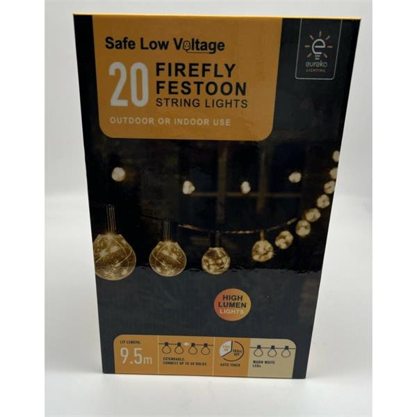 The 20 Firefly Festoon String Lights are low-voltage plug-in festoon lights designed to create a soft, magical atmosphere in both indoor and outdoor spaces. Featuring firefly-style micro lights inside each bulb, they mimic a delicate twinkling glow that’s ideal for patios, gardens, balconies, bedrooms, and decorative displays.