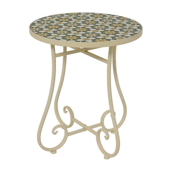 The table is supported by a cream-coloured metal frame with gracefully curved legs, offering both stability and a refined, classic look. Its compact size makes it easy to place in smaller spaces, while the durable construction makes it suitable for seasonal outdoor use. Designed to coordinate with the Madrid Mosaic Bistro Set – Cream (sold separately), this side table is a versatile and stylish addition to relaxed outdoor living.