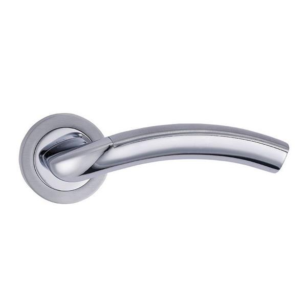 Milan Dual Satin and Polished Chrome Lever on Rose. 127.5mm lever on a 52mm dia 10mm deep round rose. All metal construction supplied with bolt though fixings and spindle. Priced and supplied in pairs with spindle and bolt fixings. See related products below for matching wc bathroom turns and key hole covers. Suitable for internal use only. 10 year mechanical warranty.
