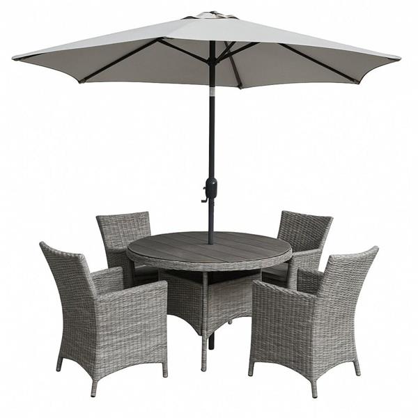 This four-seater round garden dining set is a stylish and comfortable solution for outdoor dining in gardens, patios and outdoor living spaces. Designed for relaxed family meals or entertaining guests, it includes a 1.1m round dining table, four cushioned chairs and a coordinating 2.5m parasol, creating a complete and cohesive outdoor dining setup. Its balanced proportions make it ideal for social dining while maintaining a compact footprint suitable for a wide range of outdoor areas.