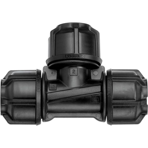 The Philmac NG Tee 1 1/2" is a strong and reliable tee fitting designed to split or combine polyethylene water pipe runs in domestic and light commercial systems. It provides a secure three-way connection while maintaining efficient water flow and system integrity.