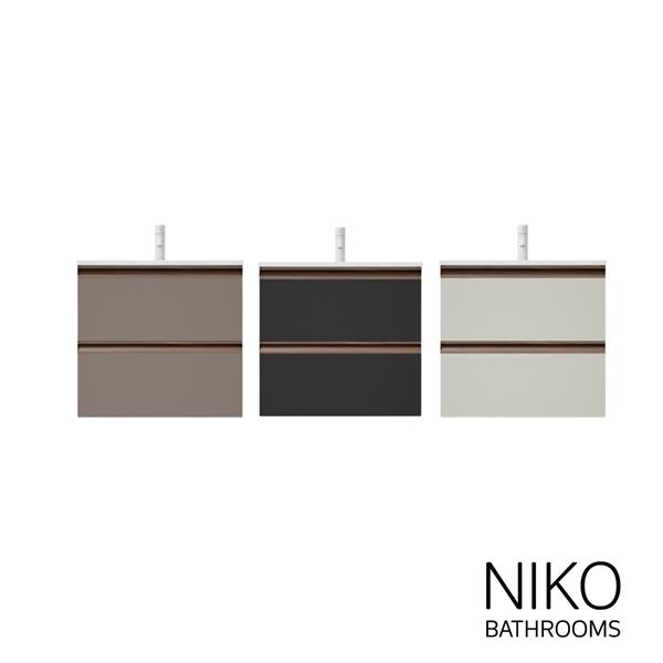 Elevate your bathroom's aesthetic with the Phoenix, a sophisticated addition to the Niko Bathrooms furniture range. This sleek unit boasts soft-close drawers and doors with integrated organisers, ensuring smooth, quiet functionality. Its antibacterial, matt lacquered finish adds a touch of elegance and hygiene.The Phoenix features full-extension drawers with integrated wooden handles for a seamlessand modern look. Available in three stylish colours and two versatile sizes, this piece effortlessly transforms your bathroom into a refined and contemporary sanctuary