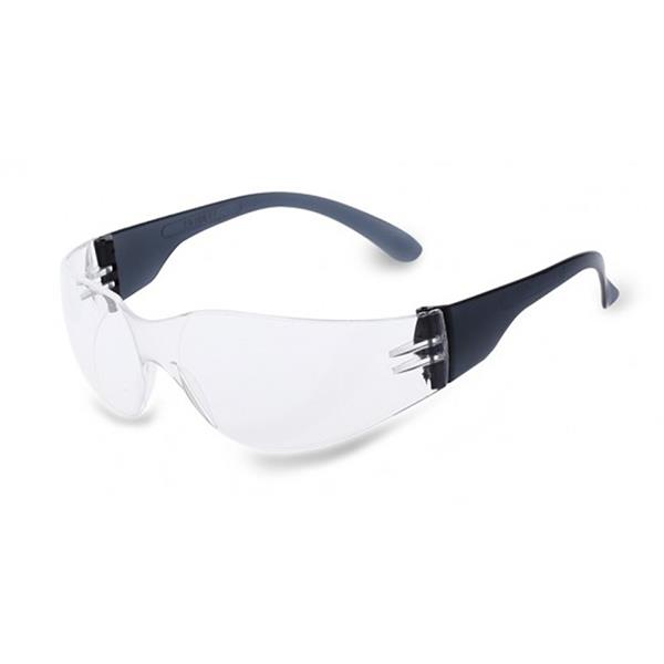 Clear lens with anti-fog and scratch-resistant coatings Wraparound design with tight fit for improved safety Flexible temples with non-slip rubber head grips