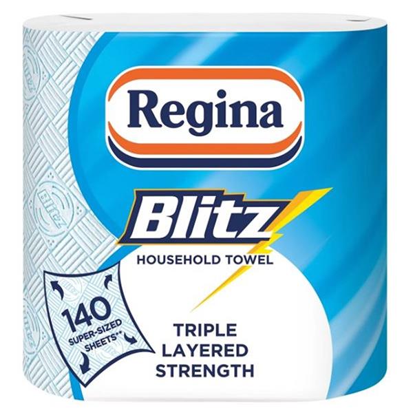 The multi - tasking household towel, all wrapped up in 100 % recyclable paper packaging. With 60 % larger than standard kitchen roll sheets, Regina Blitz is perfect for even the toughest jobs around the home.