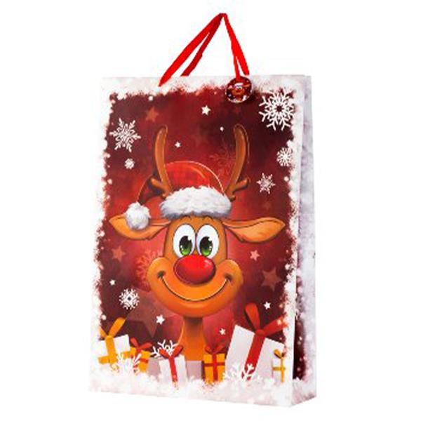 The bright red background, glossy finish, and sturdy red ribbon handles make it both practical and eye-catching — ideal for spreading Christmas cheer under the tree.