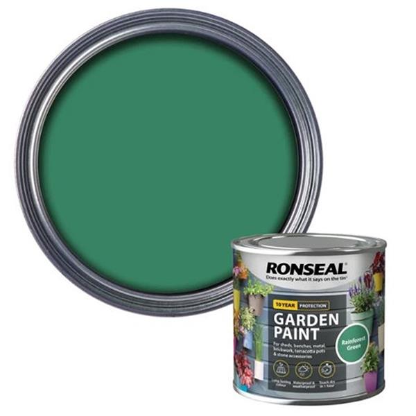 Ronseal Garden Paint 250ml Rainforest Green Add colour to your garden. Colour lasts up to 5 years. Fantastic protection against weathering. Resists fading. Resists cracking and peeling. Waterproof & Weatherproof. Water based.