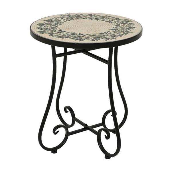Add a touch of timeless charm to your home with this elegant Santorini Mosaic Side Table. With its italian-inspired design, the round tabletop features stunning mosaic tiling with black olives. The sleek black frame with gracefully curved legs offers both stability and style, making it suitable for indoor or outdoor use. Whether you're placing it beside a sofa, on a patio, or using it to showcase a plant or decorative item, this versatile piece brings beauty and character to any space. Pair with the Santorini Mosaic Bistro Set (available separately)\n