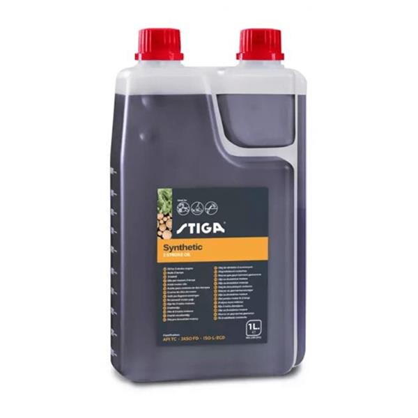 STIGA 2-stroke synthetic oil for lubrication of chainsaws and brushcutters in a 1-litre bottle with dispenser.